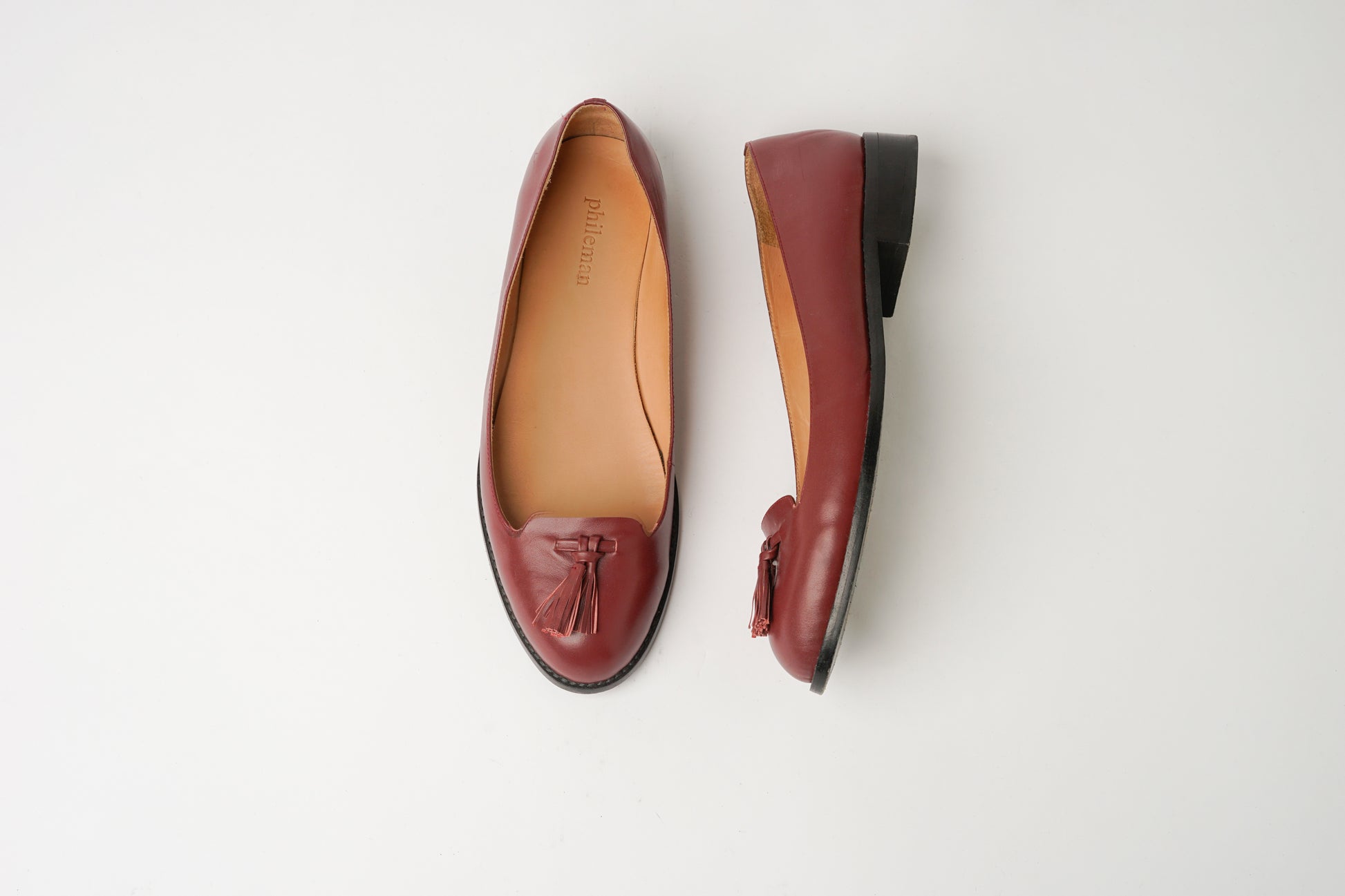 Crafted from genuine cow leather, our Burgundy Tassel Loafers offer both style and durability. The rich burgundy color adds a touch of sophistication to any outfit. The outsole is made of authentic cow leather. Expertly designed for comfort, these loafers will become a staple in your wardrobe. The insole is made of pigskin leather, which provides increased comfort. The product features a 1-inch stacked heel for added height and style. A welted bottom is used in its construction for superior durability and timeless craftsmanship. Genuine cow leather tassels adorn the design, while a lightly cushioned insole provides additional comfort and support.